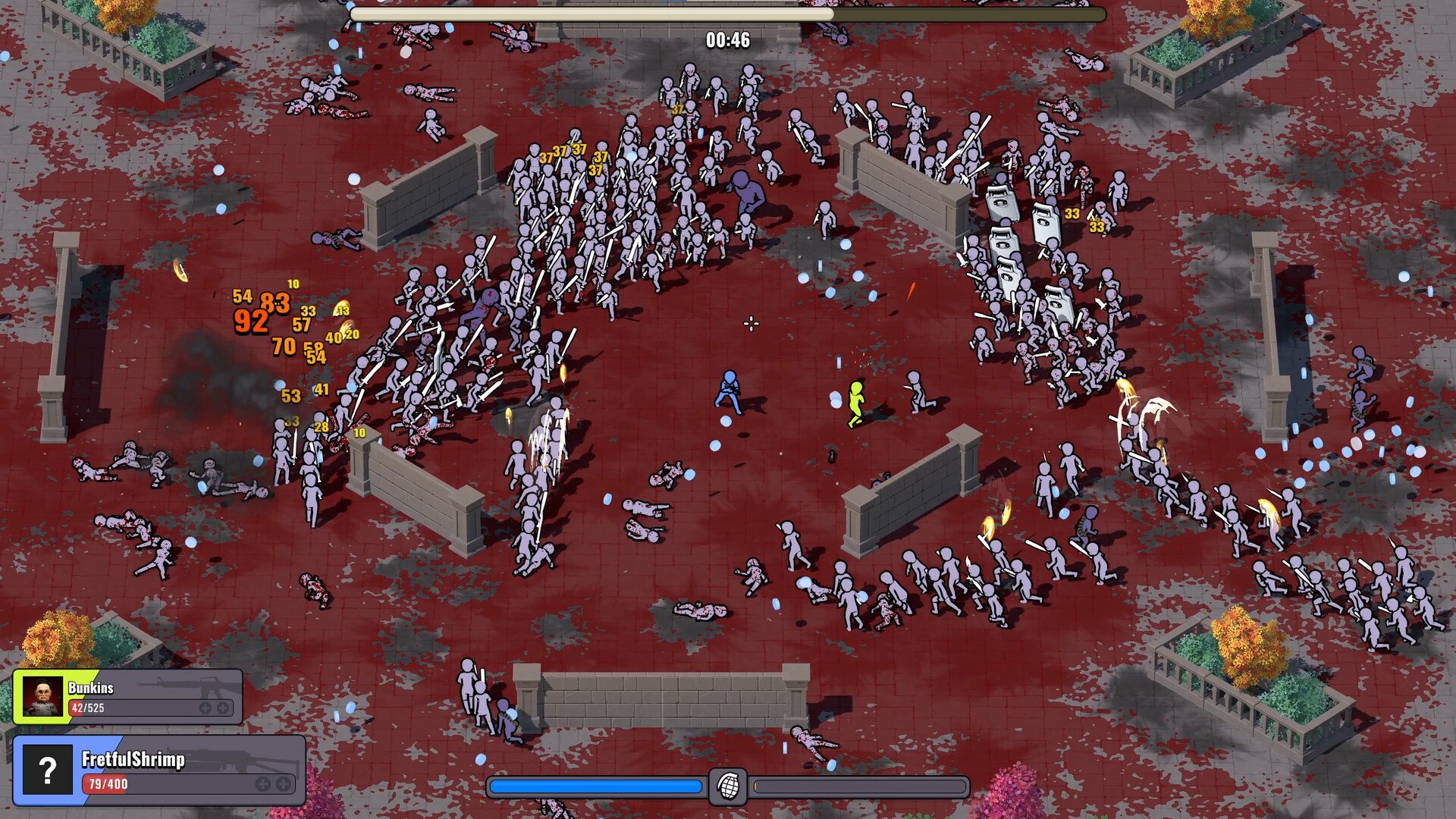 Met volledige ragdoll physics voor alle vijanden, stuur je lichamen en afgerukte ledematen door de lucht met een perfect geplaatste granaat. Zie hoe het bloed uit elke klap, snee en kogelgat spuit en de arena dynamisch bedekken. Kijk naar de littekens op het slagveld, bezaaid met scheuren en schroeiplekken - je zou het bijna kunst kunnen noemen!