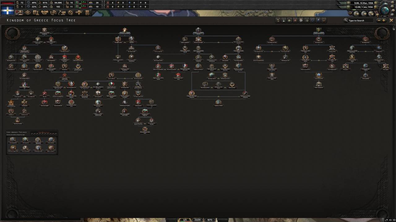 - Drzewko skupienia narodowego dla Grecji: Ożywiona podziałami politycznymi, grecka neutralność jest utrzymywana przez kontrowersyjnego Metaxasa. Zbuduj silne relacje z aliantami pod przewodnictwem króla Jerzego II, podążaj za arcykonserwatystami w kierunku faszyzmu lub przywróć chwałę greckiego imperium na wschodzie.