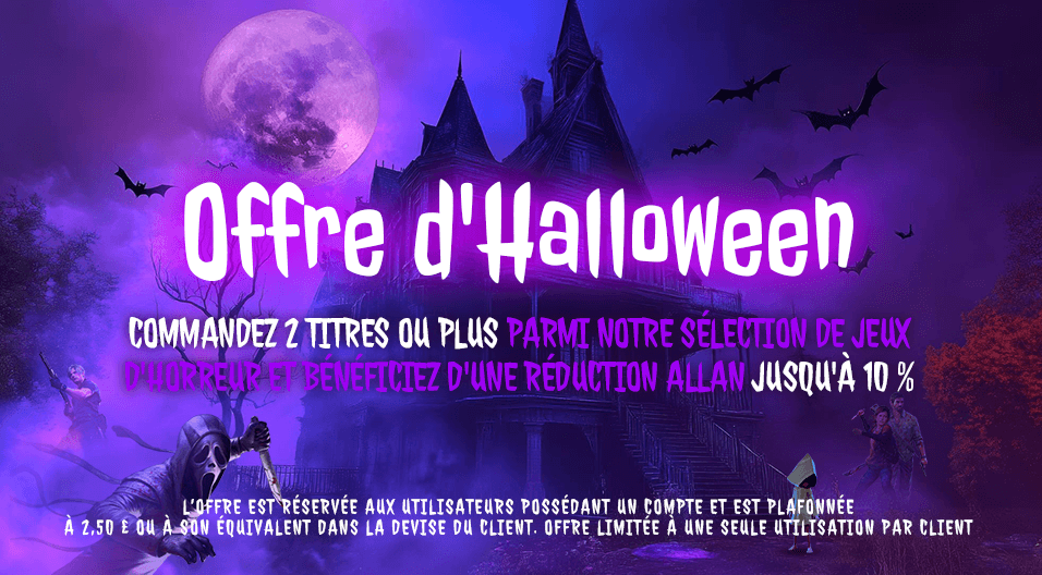Des jeux comme Dead by Daylight et Resident Evil Village à Doom: Dark Ages et Little Nightmares 3. Découvrez les jeux d’horreur préférés de Gh0stArcade pendant notre vente d’Halloween ! Achetez 2 jeux ou plus et bénéficiez d’une remise allant jusqu’à 10 % pour une durée limitée.